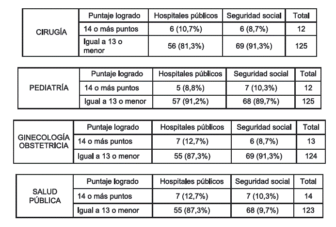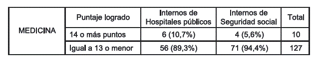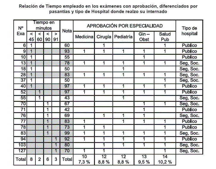 La prueba escrita se hizo a estudiantes que culminaron la carrera, a un mes al mes de terminada su práctica, el resultado de 7,3 % de aprobados, que expresa que menos de uno de cada diez venció la prueba, con la característica que las notas logradas fueron muy buenas, el rango va de 80 a 99 puntos, el tiempo empleado por estos estudiantes estuvo dentro de lo señalado para una prueba escrita de selección múltiple. Concentrando la atención en la mayoría, prácticamente de 9 de cada 10 estudiantes reprobó la prueba. Las diferencias entre estudiantes que acudieron a hospitales del sistema público y de la seguridad social, no es relevante por no tener significación estadística. (T Studente 0,066).