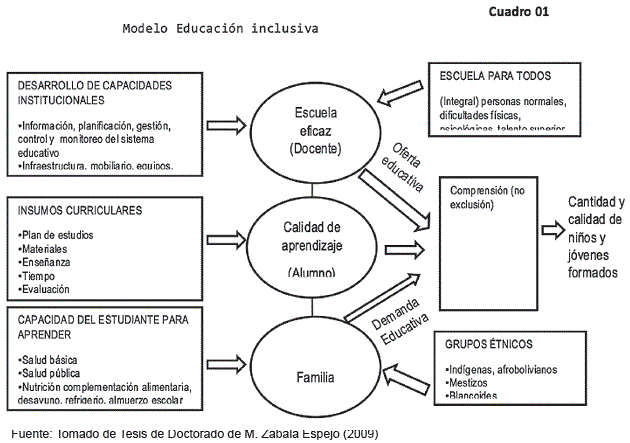 El objeto de cada sistema educativo es aumentar el número y la calidad de los egresados en los niveles de educación primaria, secundaria y superior, mediante el aumento de las probabilidades de que los estudiantes no abandonen los estudios y pasen oportunamente al grado siguiente. Además los conceptos de cultura y socialización, educación integral para todos contribuyen a la consolidación de una educación de calidad. Desde la perspectiva de una educación inclusiva, la cultura juega un papel importante inestimable por cuanto describe las decisiones que se han de adoptar a lo largo del tiempo sobre valores, normas, reglas de juicio y comportamiento que determinan a los sistemas educativos. Dicho de otro modo la perspectiva cultural está muy relacionado con los grupos étnicos que configuran la población boliviana, posibilitan el entendimiento de las tradiciones históricas y como tal influyen sobre la educación actual, estos puntos de vista son básicos en la educación inclusiva.