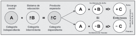 El escenario punto de partida del trabajo de investigación, está descrita en el contenido de la Figura 1, donde se expone las categorías correlacionales que, permiten describir el enfoque de la relación causa-efecto y el razonamiento de su interpretación. Distinguiendo tres categorías de correlación; la categoría A “encargo social”, la categoría B “sistema de educación”, y la categoría C “producto esperado”. Donde la categoría B, se constituye en la categoría interviniente que genera una incidencia de éxito o una incidencia de fracaso, en la expectativa de la categoría A. Concibiendo un razonamiento de que; el producto de los procesos de educación, es directamente proporcional a la pertinencia de los factores causa-efecto con los postulados de “misión-visión”.