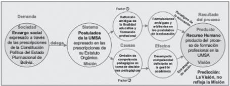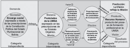 La Figura 3, y la Tabla 1 de la presente página, plantean la correlación pertinente que debe existir entre las categorías de la finalidad educativa, donde los factores de la categoría interviniente, se constituyen en acciones de pertinencia a los postulados de la educación. De ello se deduce la necesidad de reforma de los preceptos, con pertinencia a la finalidad educativa, como la reforma de los requisitos para acceder a cargos de autoridad y cargos de consejeros del cogobierno de la vida universitaria. Si estos factores causa-efecto, son pertinentes al encargo social, el producto del proceso de formación profesional, será también pertinente a ese encargo social, dando cumplimiento al mandato supremo, emanada de la sociedad hacia las instituciones de educación superior, a partir de la Constitución Política del Estado y las prescripciones que emanan del propio Estatuto Orgánico de la Universidad.