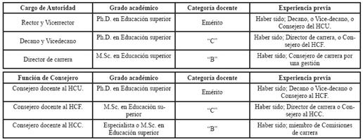 Además, estas autoridades electas que han presentado un plan de trabajo, ni votan ni dirimen en las sesiones de Consejo correspondiente; mientras que los Consejeros facultados del poder de decisión, no presentan ninguna propuesta ni compromiso con la comunidad universitaria; docentes y estudiantes con el solo requisito de ser docentes titulares y estudiantes regulares, facultados en las competencias de decisión, en el ámbito académico de la pedagogía. Los requisitos para ser electo como Rector o Vicerrector, están prescritas por la siguiente cita: