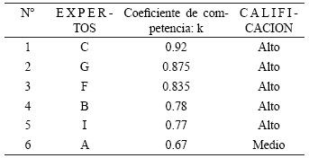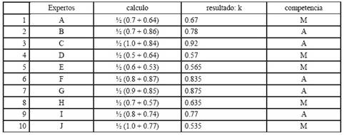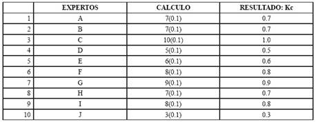 En esta metodología la competencia de los expertos se determina por el coeficiente K, el cual se calcula de acuerdo con la opinión del experto sobre su nivel de conocimiento acerca del tema que se está resolviendo, en este caso la propuesta de la Tesis.