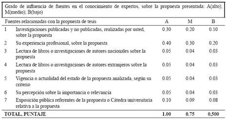 kc: es el coeficiente de conocimiento o información que tiene el experto acerca de la temática estudiada, calculado sobre la valoración del propio experto en una escala del 0 al 10. Para uso exclusivo del investigador debe multiplicado por 0,1. La calificación de cero (0), indica que el experto que no tiene absolutamente ningún conocimiento sobre la propuesta presentada. La calificación de 10 significa que el experto tiene pleno conocimiento de la propuesta. Entre estas dos evaluaciones extremas hay ocho intermedias. Se solicitó a los 10 expertos de la lista inicial, que marquen con una cruz, en la escala creciente de 1 a 10 el valor que corresponde con el grado de conocimiento o información que tienen sobre la Propuesta de la Tesis.