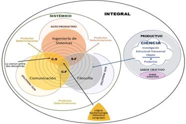 Tres disciplinas, encontradas, inicialmente inconexas, Comunicación; Ingeniería de Sistemas; Filosofía, representan su saber con tres círculos de diferente color, visualizándose un contacto, que puede ser crítico y surgen las relaciones C-S; C-F; S-F, pero hay un punto fundamental donde se intersecan las tres disciplinas, por sus contenidos esenciales: Lógica; Epistemología; Metódica; Lenguaje. Este punto es el espacio de reflexión, discusión y producción donde actúa la dialéctica, impulsando hacia afuera a las disciplinas en proceso de integración (estructurándose entre sí y transversalizándose), desde lo teórico, hasta lo no teórico (productos determinados).