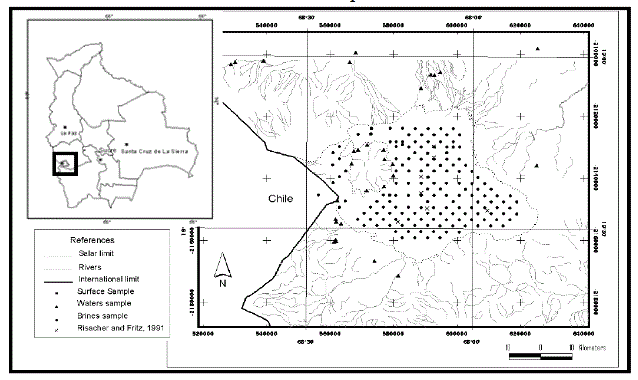 En el marco de la Federal Direction for International Cooperation, la Universidad de Liege y la Universidad Técnica de Oruro, han efectuado una prospección del Salar de Coipasa sistemática con una malla de 2 por 2 km superpuesta a la corteza salina que ha permitido la recolección de muestras de salmueras superficiales rompiendo la costra salina con una barra de hierro hasta alcanzar el nivel de la capa de salmuera (de 5 a 20 cm por debajo de la costra salina). J. Andrew Nunnerya, et al., 2002). La figura siguiente muestra la ubicación y los puntos de muestreo: