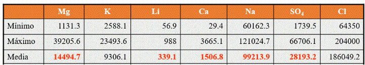 La tabla siguiente, muestra los resultados de los análisis de 220 muestras de salmueras del Salar de Coipasa (V. Lebrun et al., 1997; Risacher, F. & Fritz, B. (1991); Pirard, Eric (2011).