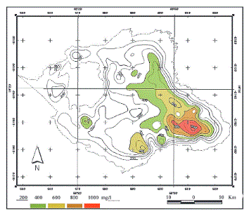 Figura 3.- Curvas de isoconcentraciones de Li en el Salar de Coipasa (V. Lebrun et al., 1997)