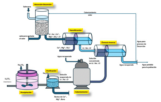 -    Enriquecimiento de Li por procesos de adsorción y desorción. Para la desorción se requiere agua pura procedente de la osmosis inversa, la que debe ser calentada por energía solar.