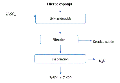 La obtención de hierro heptahidratado a partir de una muestra de hierro esponja de una siderúrgica peruana (Aceros Arequipa), que tiene características similares a las que tendrá dicho material en el proceso a implementarse en el Mutún, ha sido sometido a un proceso de lixiviación acida a alta temperatura con ácido sulfúrico diluido a objeto de formar sulfato ferroso acuoso en solución y liberar hidrógeno; la solución es filtrada para separar el material oxidado y los residuos metálicos presentes; y luego someter la solución filtrada a un proceso de cristalización mediante enfriamiento a objeto de que se formen los cristales puros de FeSO4 *7 H2O.