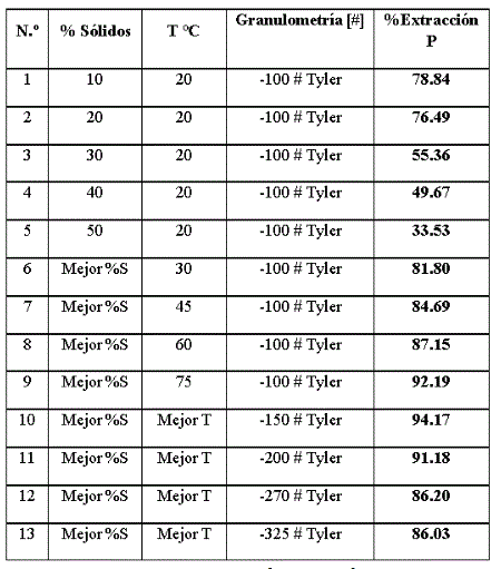 Los resultados de las extracciones de fósforo de las pruebas para un tiempo de una hora de lixiviación y variando diferentes parámetros, se presentan en la tabla siguiente: