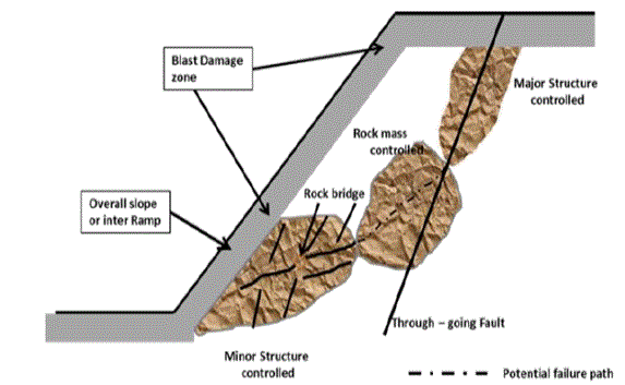 A influência potencial dos danos causados por detonacáo no colapso de taludes depende da escala do talude. Em minas a céu aberto, o colapso inter-rampa ou o colapso geral do talude pode ser influenciado pelos danos causados por detonacáo, seja danificando a rocha intacta (overbreak), estendendo descontinuidades pré-existentes ou reduzindo a resistência ao cisalhamento ao longo das descontinuidades (SHARMA, 2017).