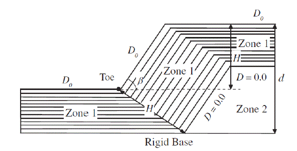 HOEK (2012) sugeriu uma geometria na qual o modelo é dividido em duas zonas principais (conforme mostrado na Figura 2): a zona de dano por detonacáo e a zona não danificada. A espessura da zona de dano por detonacáo depende da altura do talude, conforme sugerido por HOEK E KARZULOVIC (2000). A geometría é adequada para taludes em escala de bancadas, uma vez que pode gerar zonas de dano por detonacáo irreais quando usada para taludes em escala global. LI et al. (2011) avaliaram o papel do dano por detonacáo em um talude, atribuindo o fator de dano como contornos que diminuem em direcáo ao centro do talude (Figura 3). Os autores utilizaram essa geometria (com profundidade de talude de 50m e 80m) na modelagem contínua de um talude danificado por detonacáo utilizando o SLIDE (ROCSCIENCE 2010 APUD LUPOGO, 2017). Não há diretrizes sobre como usar essa geometria e, até onde se sabe pelos autores, ela tem aplicacáo muito limitada ou nenhuma na prática de engenharia. A escala na qual os métodos propostos para o dano por detonacáo foram aplicados aos dados recebeu pouca atencáo, e as diretrizes práticas para o uso dos valores "D" são extremamente limitadas. Dada a importante implicacáo para simulacóes realistas de modelos de taludes, tanto para o valor do disturbio da detonacáo assumido quanto para a extensão do dano por detonacáo atrás de um talude de cava, os autores consideram esse tópico urna área importante para pesquisas futuras. Essa abordagem aparentemente subjetiva para o dano por detonacáo foi um fator importante para a pesquisa atual.