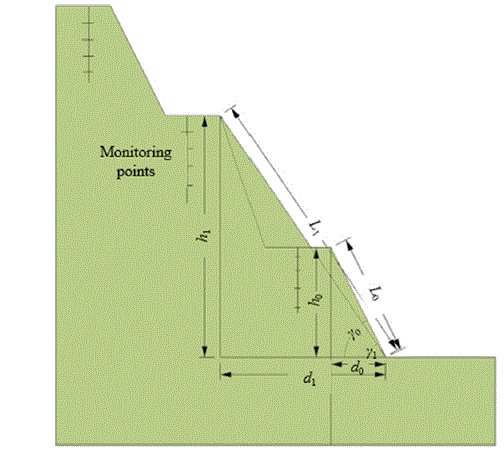 Onde Api é o fator de inclinacáo; I, a taxa de inclinacáo; L, o comprimento da inclinacáo; c, d, e e f, os coeficientes de influência de correlacáo; e i representa o fator de inclinacáo correspondente ao número de plataformas, conforme mostrado na Fig. 4. Considerando a influência da forma da encosta na vibracáo causada pela detonacáo, a Eq. (7) é substituída na Eq. (4) como um fator de influência. A fórmula do deslocamento da encosta sob a detonacáo é apresentada na Eq. (8), e a Eq. (9) é obtida após simplificacáo.