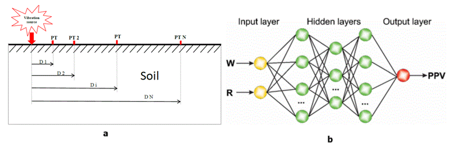 Fig. 5. (a)Princípio do método (b) Estrutura do modelo de ANN para prever o PPV