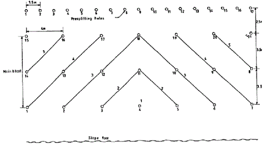). No estudo conduzido por (SINGH; SINGH, 1995), aplicaram a técnica de pré-corte que reduziu significativamente irregularidades e descontinuidades na cava final, minimizando a presenca de rochas soltas e fragmentacáo indesejadas. Foi possível aumentar a altura das bancadas de 10m para 20m e o ángulo geral de 45° para 60°, maximizando a recuperacáo do minério e reduzindo volumes de sobrecarga, a figura 6 mostra o padrão de perfüracáo e detonacáo dos furos principais e de pré-corte.