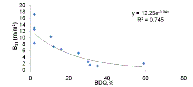 Fig.7 A intensidade das fraturas de explosão como fiincao da qualidade do dano da explosão
