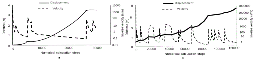 A velocidade inversa e o deslocamento de um modelo de talude podem ser analisados ao longo do tempo para entender os mecanismos de falha. A estabilidade do talude é avaliada com base nos dados de velocidade, identificando se o movimento é regressivo (desaceleracao periódica, indicando estabilidade) ou progressivo (deslocamentos acelerados, indicando falha). As figuras 9a e 9b mostram gráficos da velocidade inversa e deslocamento em x para modelos 3DEC com e sem fraturas de explosão. O modelo sem fraturas apresenta um deslocamento mais uniforme, enquanto o modelo com fraturas exibe mudancas no gradiente e comportamento de stick-slip, com deslocamentos maiores e mais complexos. O modelo com fraturas requer mais cálculos e tempo de execucáo devido a maior quantidade de blocos e complexidade. Os resultados indicam que o talude com fraturas apresenta deslocamentos maiores, com um aumento no número de etapas de cálculo e maior interdependência entre os blocos.