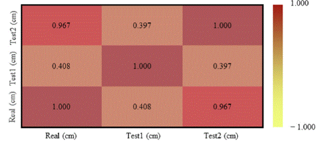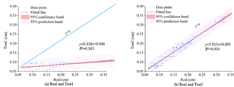 No estudo conduzido por (WU et al., 2024), este estudo proporciona uma melhoria significativa para a fórmula de Sadowski ao incorporar o fator de influência da inclinacao, melhorando assim sua capacidade preditiva em relacao aos deslocamentos induzidos por vibracóes de detonacáo em encostas. A aplicacao da fórmula de Sadowski modificada foi validada com sucesso em cenários de engenharia, oferecendo uma base confiável para garantir a seguranca do pessoal envolvido na construcao subsequente de encostas em múltiplos estágios. Conforme mostrado na Fig. 10 o valor do coeficiente de Pearson entre Real e Testl é 0,408, o que confirma uma correlacáo moderada para o caso sem a introducáo do fator de forma da inclinacáo. O valor do coeficiente de Pearson entre Real e Test2 é 0,967, o que demonstra uma correlacáo muito forte quando a fórmula de Sadowski introduz o fator de forma da inclinacáo.