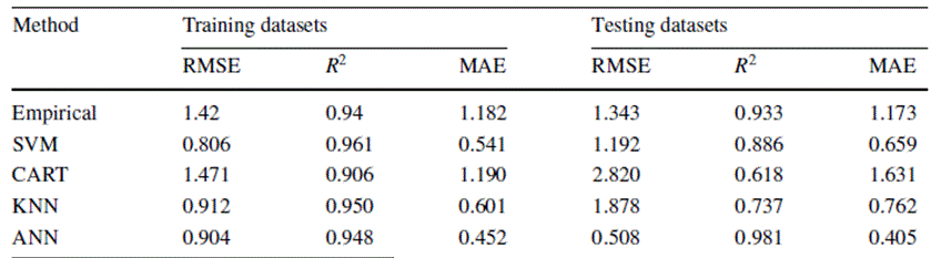 Uma comparacao entre modelos computacionais avancados e técnicas experimentais na previsão de vibracóes do solo induzidas por detonacóes em minas a céu aberto de carvão, um estudo conduzido por (NGUYEN; BUI; MOAYEDI, 2019), com base nos resultados obtidos na Tabela 1, o modelo de ANN Rede Neural Artificial (ou seja, ANN 2-6-8-6-1) apresentou o melhor desempenho, com um RMSE de 0,508, R2 de 0,981 e MAE de 0,405 no conjunto de dados de teste. Além disso, o erro entre o RMSE e o MAE (ou seja, RMSE - MAE = 0,508 - 0,405 = 0,103) foi o menor. Isso é a base para concluir