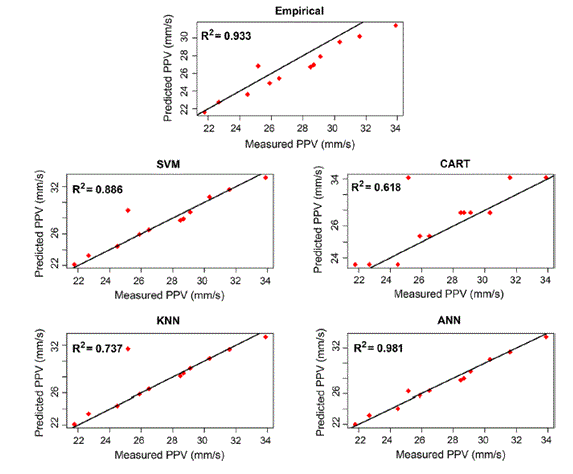 O modelo de ANN foi o mais eficaz na estimativa de vibracao do solo induzida por detonacao, com RMSE de 0,508, R2 de 0,981 e MAE de 0,405, sendo capaz de explicar tanto relacóes lineares quanto não lineares entre W e R. No entanto, encontrar o modelo ideal para prever o PPV em aprendizado de máquina é desafiador e exige um processo de "tentativa e erro". Comparar diversos modelos preditivos ajuda a identificar o melhor para prever com precisão o PPV em detonacóes em minas a céu aberto. A Figura 10 apresenta o desempenho dos modelos com base no R2.