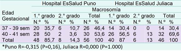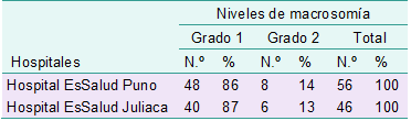 En el Hospital EsSalud Puno, los factores peso pregestacional y antecedente de macrosomía, se asocian significativamente a la macrosomía de recién nacidos, en cambio, en el Hospital EsSalud Juliaca, los factores son: edad materna, peso pregestacional y antecedente de macrosomía. Entonces, del total de recién nacidos macrosómicos, es más frecuente la macrosomía de primer grado (grado I) en ambos hospitales, mientras la macrosomía de segundo grado (grado II) se presenta en un poco más de la décima parte de la población en estudio.