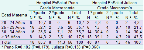 Según la prueba correlación de Pearson, en el Hospital EsSalud Puno es P=0,179 y en Juliaca P=0,360. Eso implica que la edad materna presenta correlación positiva muy baja con los nacimientos macrosómicos y, por tanto, se rechaza la hipótesis alterna, aceptándose la hipótesis nula.