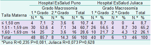 Según la prueba Correlación de Pearson, la talla materna presenta correlación negativa muy baja con los nacimientos macrosómicos en el hospital EsSalud Puno (p=0,081) y en el Juliaca la correlación es positiva muy baja (p=0,628); por tanto, se rechaza la hipótesis alterna y se acepta la hipótesis nula.