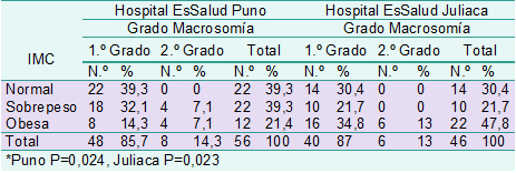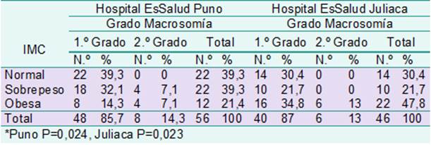 Los resultados demuestran que la mayor parte de madres de los recién nacidos macrosómicos, presentaban sobrepeso y obesidad en ambos hospitales; este antecedente fue un factor importante porque los neonatos nacieron con macrosomía de I y II grado. Al respecto, según Alarcón-Gutiérrez et al. (5), estudios han demostrado que el peso del recién nacido está relacionado significativamente con el IMC preconcepcional. En esa dirección, los hallazgos presentan similitud con el estudio, puesto que, se encontró una asociación significativa tanto en el hospital de EsSalud Puno y Juliaca (30). También debe destacarse que Crane et al. (31) señalaron que son diversos estudios que observan una frecuencia mucho mayor de macrosomía en mujeres obesas. Esto es una evidencia para considerar que en Puno el sobrepeso y la obesidad constituyen un riesgo para la macrosomía, como se evidencia en los resultados al encontrar asociación significativa. En la misma línea, el riesgo de desarrollar macrosomía se encuentra la obesidad materna (11).