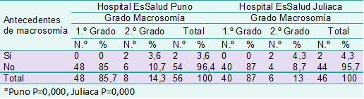 Según la prueba Chi Cuadrado, en el hospital de EsSalud Puno y Juliaca el antecedente de macrosomía presenta asociación significativa (p=0,000), con los nacimientos macrosómicos; por tanto, se acepta la hipótesis alterna y se rechaza la hipótesis nula.