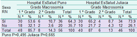 Según la prueba Chi Cuadrado, en el hospital de EsSalud Puno y Juliaca, el sexo del recién nacido macrosómico no presenta asociación significativa (p=0,495 Puno; p=0,665 Juliaca), con los nacimientos macrosómicos; por tanto, se rechaza la hipótesis alterna y se acepta la hipótesis nula.