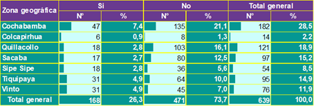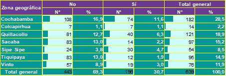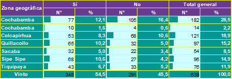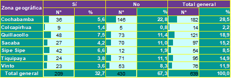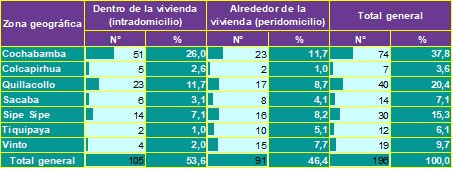 El estudio se llevó a cabo en viviendas de los municipios que conforman la Región Metropolitana de Cochabamba durante el segundo semestre del 2024. La muestra estuvo conformada por 639 personas. Los resultados indican que un 30,7 % de los encuestados han observado vinchucas en su vivienda, con una mayor prevalencia en Cochabamba (11,6 %) y Quillacollo (6,3 %). Estos valores reflejan una persistencia del vector en zonas urbanas y periurbanas, similar a estudios previos en Bolivia, donde se ha reportado una presencia significativa de Triatoma infestans en viviendas de áreas con alta densidad poblacional (11,12).