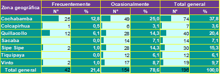 El 21,4 % de los encuestados informó observar vinchucas frecuentemente, mientras que un 78,6 % lo hicieron ocasionalmente. Comparado con estudios de control vectorial en Brasil y Colombia, donde la tasa de observación frecuente es menor al 10 % en áreas con programas efectivos de fumigación (15), los datos en Cochabamba podrían indicar deficiencias en la intervención y eliminación del vector (7).