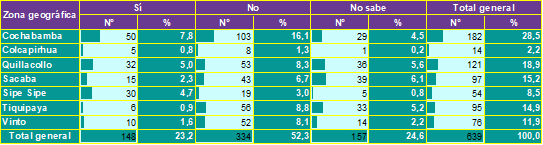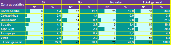 La segunda sección analiza si se han efectuado actividades relacionadas con la captura y análisis del vector en las viviendas o en las zonas de residencia. La tabla 4, muestra la proporción de encuestados que tienen conocimiento sobre la recolección de vinchucas en su entorno. La tabla 5, presenta el nivel de conocimiento de la población respecto a si los insectos recolectados fueron analizados en laboratorio para detectar la presencia del parásito Trypanosoma cruzi.