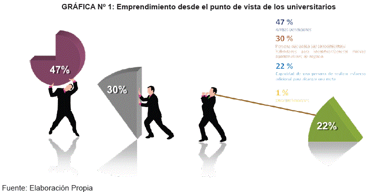 En este sentido, el 30% del total de estudiantes entrevistados mencionaron que emprenderse refería a cuando una persona aplicaba sus conocimientos y habilidades para identificar/generar nuevas oportunidades de negocio (emprender es "crear nuevas empresas"). Para el 22% de los universitarios, emprender es la capacidad de una persona de realizar esfuerzo adicional para alcanzar una meta. Asimismo, el 47% de los alumnos entrevistados coincidía en que ambas proporcionaban una definición de lo que ellos entendían por emprender. El 1% restante de estudiantes propuso otra definición entre las que destacan los siguientes términos asociados a: (i) la persona emprendedora (valiente, aventurero, confianza, arriesgado, ilusionado, constancia, liderazgo, actitud ante la vida, trabajo en equipo, sin miedo al fracaso, etc.), (ii) a las iniciativas emprendedoras (ideas innovadoras, nicho de mercados, satisfacer/ crear necesidades, idea pionera, etc.), (iii) a sus expectativas profesionales y laborales (opción laboral, medio de obtención de ingresos, etc.), y (iv) a las condiciones del entorno (situación económica, ampliar los horizontes para contribuir al desarrollo económico, etc.).