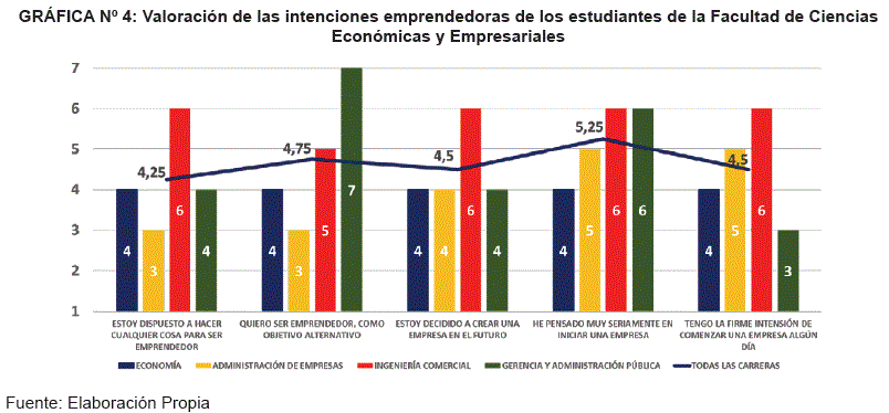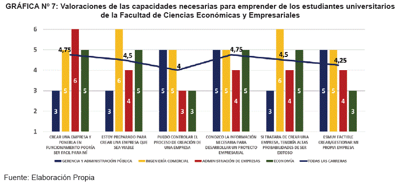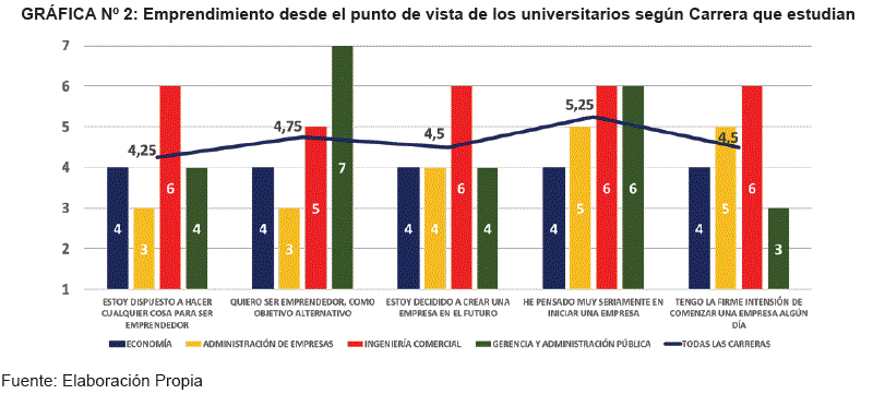 El segundo indicador recoge la actitud hacia el emprendimiento a través de una escala Likert de 1 (completamente en desacuerdo) a 7 (completamente de acuerdo) en la que los estudiantes valoraron una serie de afirmaciones vinculadas a este factor motivacional del individuo (véase la Gráfica N° 5).