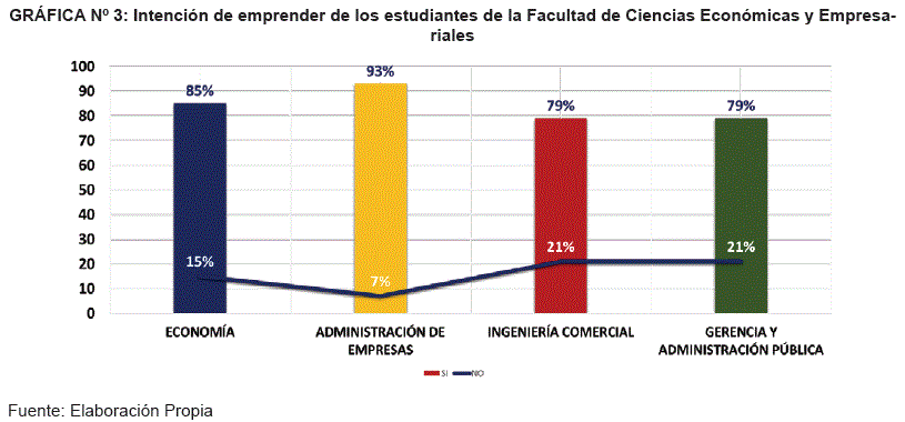 La primera medición de emprendimiento potencial consistió en preguntar a los alumnos sobre su intención de crear una empresa en un horizonte temporal de los próximos años. Al respecto, el 94% del total de los entrevistados contestó afirmativamente a esta cuestión; de los cuales, el 21% es aportado por los estudiantes de Gerencia y Administración Pública, el 24% es de Economía, 28% de Administración de Empresas y 21% de Ingeniería Comercial (Gráfica N° 3).
