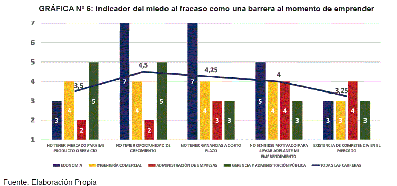 Cada uno de los indicadores mencionados en el gráfico nos muestra un promedio de 3.9, indicador que nos muestra el miedo al fracaso en cada una de las Carreras de la Facultad de Ciencias Económicas y Empresariales, este hecho se evidencia en mayor medida (7 frente a 2), y podría poner de manifiesto que la falta de no tener mercado para su producto o servicio, no tener oportunidad de crecimiento, no tener ganancias a corto plazo, no sentirse motivado para llevar adelante su emprendimiento y sobre todo la existencia de competencia en el mercado, indicadores que forman la principal barrera hacia el emprendimiento de nuestros universitarios de las Carreras de la Facultad de Ciencias Económicas y Empresariales.