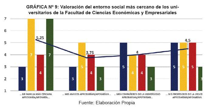En términos generales, la mayoría de las afirmaciones presenta una valoración por encima de la media. La más valorada está relacionada con la percepción del apoyo de los miembros de la familia (5,25 sobre 7) seguido del apoyo de parte de profesores de la universidad (5,6 sobre 7). Según la Carrera que se encuentran estudiando, a pesar de una ligera diferencia, las tendencias son muy similares. Si profundizamos un poco en el perfil de los estudiantes, observamos que las valoraciones promedio tienden a ser ligeramente mejores en universitarios que tienen experiencia profesional y están vinculados a grados en Administración de Empresas y Gerencia y Administración Pública. Dado la importancia que otorgan a la opinión de su entorno más cercano los universitarios. De una forma más directa, se les preguntó a los universitarios entrevistados sobre el nivel de importancia que les otorgaban a las opiniones de las diversas personas que forman parte de su entorno social más cercano o en el que se rodean cotidianamente (Gráfica N°9).