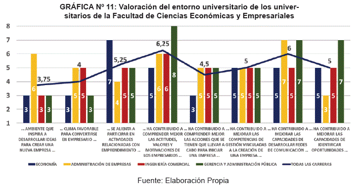 En lo relativo al segundo indicador, la Gráfica N° 11 muestra las valoraciones que han otorgado los estudiantes entrevistados a la percepción y contribución de los diversos aspectos del entorno universitario en sus actitudes/capacidades emprendedoras.