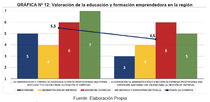 En cuanto a la percepción sobre las universidades y centros de enseñanza superior proporcionan una formación adecuada y de calidad para la creación de empresas, los entrevistados han otorgado una valoración de 5,5 y 4,5 (entre la valoración media de 4 sobre 7). Esto implica que, en promedio, los estudiantes tienen una percepción más favorable de que las universidades, y los sistemas de formación profesional proporcionan una formación adecuada y de calidad para la creación de empresas.