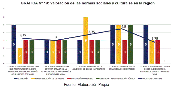 En cuanto a la percepción del papel de la cultura en emprendimiento de su región, el Gráfico N° 13 presenta una valoración de 4,5. En este indicador, los estudiantes tienen una percepción ligeramente similar que la otorgada a la educación y formación en emprendimiento.