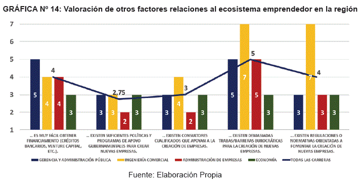 En cuanto al resto de condiciones que integran el ecosistema emprendedor de su región, el Gráfico N° 14 muestra que los estudiantes han otorgado valoraciones muy bajas.