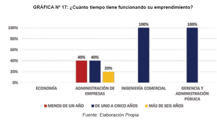 En el gráfico precedente, nos muestra que los estudiantes de la Facultad de Ciencias Económicas y Empresariales dentro de algunas Carreras tienen emprendimientos, a saber: la Carrera de Administración de Empresas el 50% de sus estudiantes cuentan con un emprendimiento, no se quedan atrás las Carreras de Gerencia y Administración Pública (17%) y la Carrera de Ingeniería Comercial (10%), la Carrera de Economía no tiene emprendimientos porque su perfil profesional, está capacitado para dirigir o asesorar empresas respecto al análisis de las tendencias de la evolución del sistema económico nacional e internacional, descubriendo en ellas oportunidades de negocios y recomendando tanto las operaciones comerciales y financieras.