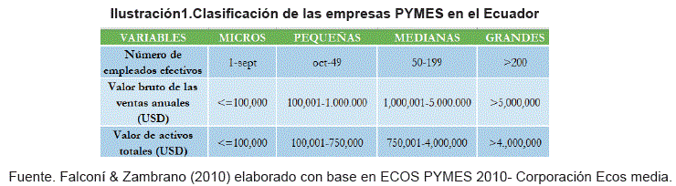 Particularmente la Comunidad Andina de Naciones (CAN) ha avanzado de manera significativa en la conceptualización y categorización de las PYMES, consideran que las micro, pequeñas y medianas empresas se catalogan considerando las siguientes variables: número de empleados efectivos, valor bruto de las ventas anuales, y monto de los activos totales (Comunidad Andina, s.f.). Específicamente en el Ecuador las PYMES se pueden clasificar con base en la ilustración 1, en esta consideran tres variables que son: número de empleados, valor bruto de ventas y valor de activos totales.