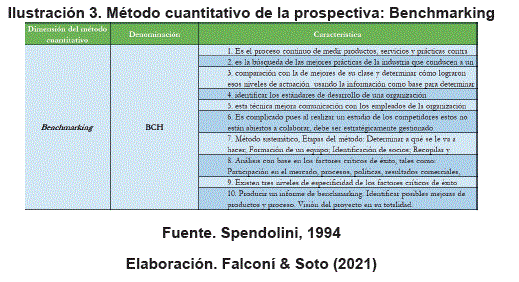 Los métodos cuantitativos de la prospectiva "usa la recolección de datos para probar hipótesis, con base en la medición numérica y el análisis estadístico, para establecer patrones de comportamiento y probar teorías". (Hernández, Sampieri, Roberto; Fernández, Carlos y Baptista, Pilar, 2010, pág. 46). De acuerdo a lo señalado es un análisis mediante la utilización de técnicas estadísticas para explicar variables que comprenden una hipótesis. Aquí precisaremos uno de estos métodos, nos referimos al Benchmarking "Un proceso sistemático y continuo para evaluar los productos, servicios y procesos de trabajo de las organizaciones que son reconocidas como representantes de las mejores prácticas, con el propósito de realizar mejoras organizacionales". (Spendolini, 1994, pág. 11). Cabe destacar que la esencia del Benchmarking es sencilla, significa "sertan humilde para admitir que alguien puede hacer algo mejor que uno y tan ambicioso para intentar alcanzarlo y superarlo". (Mora, 2009, pág. 21). Se basa en la identificación de los estándares de desarrollo de una organización desde varios factores críticos de éxito, tales como: procesos, políticas, resultados comerciales, participación en el mercado, entre otros, todo en búsqueda de las mejores prácticas de excelencia (ver ilustración 3).