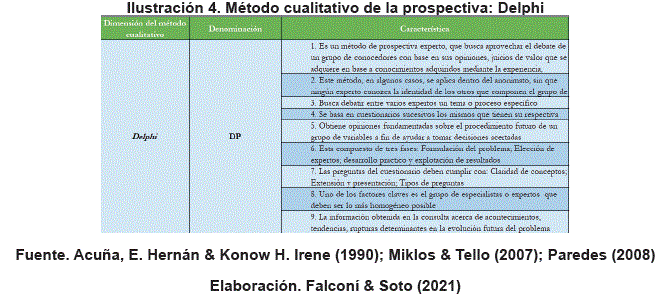 Ahora bien, los métodos cualitativos de prospectivas tienen como resultado información de situaciones, eventos, acciones, estudios de casos, experiencias personales, historias de vida, entrevistas y experiencia de los participantes, dado que, se consideran las técnicas de aplicación del pensamiento (Paredes, 2008). Dentro de la diversidad de estos métodos, hemos escogido el método Delphi, el cual puede ser caracterizado como un método para estructurar el proceso de comunicación grupal, de modo, que ésta sea efectiva para permitir a un grupo de individuos, como un todo, tratar con problemas complejos (Acuña, E. Hernán & Konow H. Irene, 1990). Este parte de una serie de cuestionarios inteligentes articulados sistémicamente, los cuales contienen suficiente información básica para que las respuestas, abiertas pero acotadas, tengan fundamento (Miklos & Tello, 2007). Los cuestionarios así elaborados se entregan iterativamente a expertos procurando definir asintóticamente escenarios diferenciados con un mínimo de tres a cinco ciclos de preguntas y respuestas, a fin de lograr que las opiniones se concentren, se enriquezcan y se discriminen entre sí. En otras palabras, es un método de prospectiva de experto, que busca aprovechar el debate de un grupo de conocedores, con el fin de obtener un consenso y derivar una conclusión lo más confiable posible (ver ilustración 4).