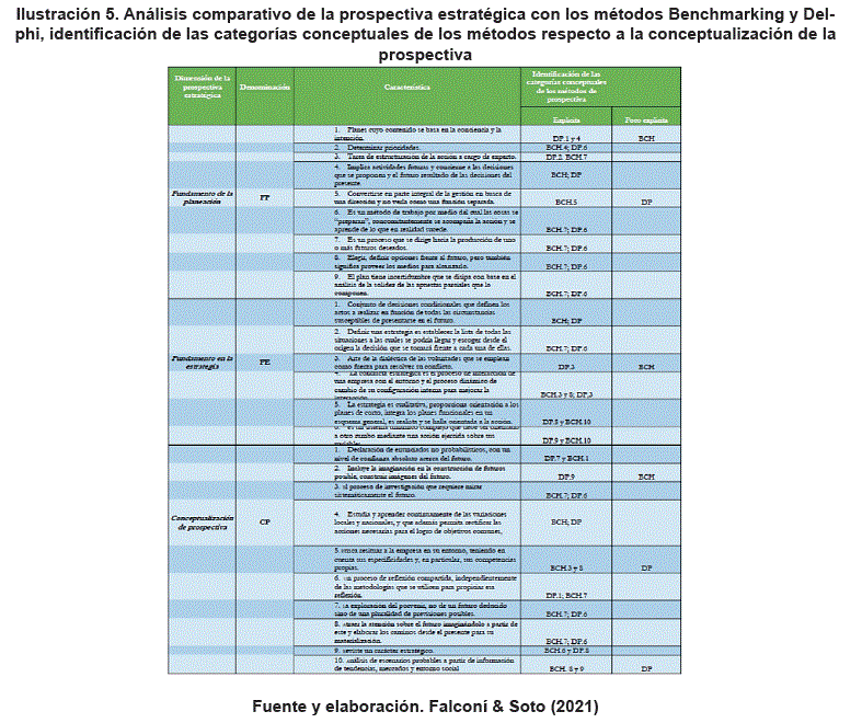 En suma, ambos métodos, tanto cuantitativo como cualitativo (Benchmarking y Delphi) confluyen en futuros posibles con base en la configuración de estrategias dinámicas e interactivas con el entorno, de hecho, en su mayoría presentan de forma explícita las caracterizaciones de los fundamentos de la prospectiva estratégica, es decir, tanto la planificación, la estrategia como su conceptualización. Sin embargo, cada uno posee caracterizaciones diferentes que abordan de maneras distinta el estudio de la organización, al compararlos se identificaron algunas categorías conceptuales menos explícita de un método con respecto al otro, específicamente las que se refieren a: los planes cuyo contenido se basa en la conciencia y la intención; convertirse en parte integral de la gestión en busca de una dirección y no verla como una función separada; el uso del arte de la dialéctica de las voluntades que se emplean como fuerza para resolver su conflicto; busca resituar a la empresa en su entorno, teniendo en cuenta sus especificidades y, en particular, sus competencias propias y el análisis de escenarios probables a partir de información de tendencias, mercados y entorno social.