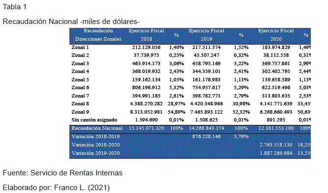 En la tabla 1, se puede apreciar la recaudación tributaria de los ejercicios fiscales 2018 al 2020 de cada una de las Direcciones Zonales en que se encuentra distribuida la Administración Tributaria en Ecuador. En donde se puede observar que más del 50% de la recaudación proviene de la Zonal 9. También se puede evidenciar, la disminución de la recaudación nacional en los años estudiados, siendo esta del 5,79% en el año 2019 y del 18,25% en el año 2020, en comparación con el año 2018; mientras que la disminución del año 2020 en comparación con el año 2019 fue del 13,23%.