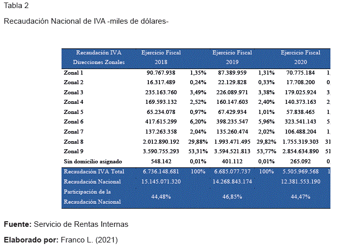 En la tabla 2, se observa la recaudación de IVA en cada dirección zonal, en la cual se mantiene la tendencia de que la Zonal 9 es la que recauda más del 50%; así como también se aprecia el decrecimiento de la recaudación entre un año y otro. Sin embargo, es importante destacar que, pese a la disminución de la recaudación, la participación de IVA en la recaudación nacional se mantiene sobre el 40%, siendo así que en el año 2018 fue del 44,48%, en el año 2019 del 46,85% y en el año 2020 la participación fue del 44,47%,