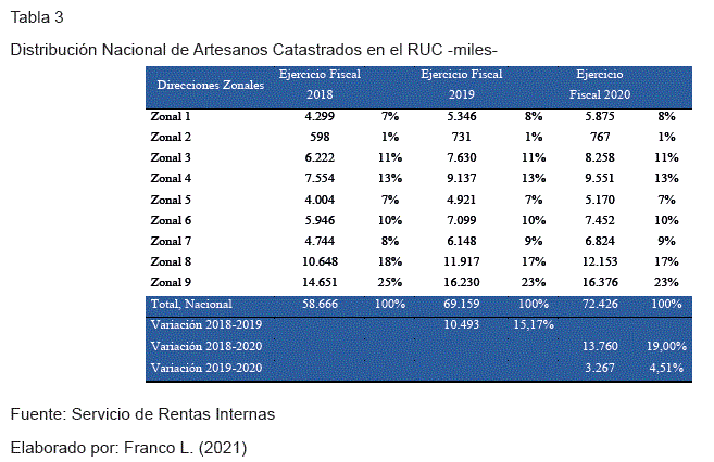 En la tabla 3 se observa el crecimiento de los artesanos catastrados en la base de datos del RUC que mantiene el SRI, siendo las Zonales 9, 8 y 4 lasque concentran el mayor número de artesanos. Este incremento fue del 15,17 % en año 2019 y del 19% en el año 2020 en comparación con los artesanos registrados en el año 2018. Mientras que, el incremento del año 2020 fue del 4,51% en comparación con el año 2019. Estos datos reflejan que los artesanos son un importante grupo de contribuyentes que año a año aumentan en número considerablemente.
